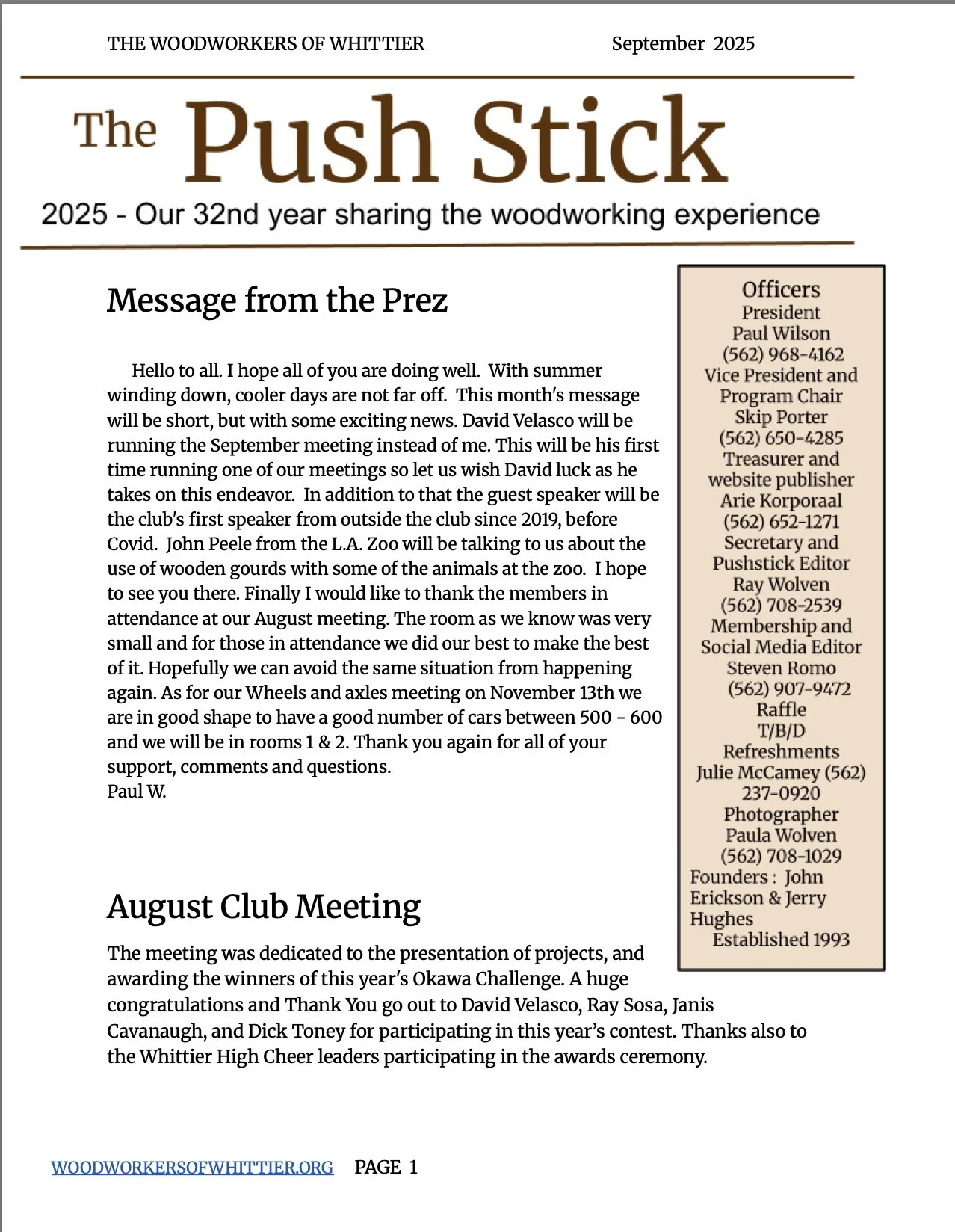 Members should have received their electronic copy by now. If you are a member and have not received the September 2025 issue, send an email to pushstick@woodworkersofwhittier.org. You will be added to the distribution list and a copy of the current issue will be sent to you posthaste.